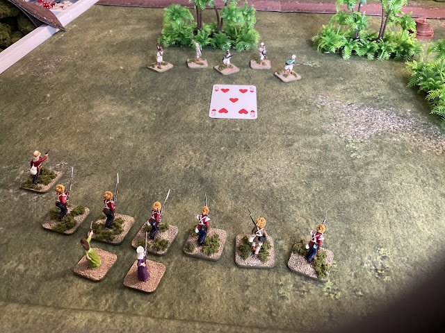 Night had fallen. A dice roll determined that Napiers force came on in zone 3 and their arrival caused the playing card for the zone to be immediately revealed. If the card had been a black suit then Napier would have been unopposed but it wasn’t it was red with a value of 5 - meaning 5 sepoys had been surprised by the groups arrival.